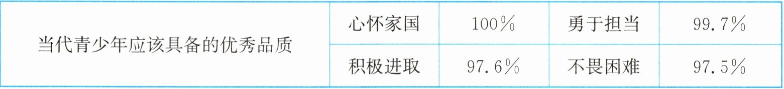 (1)观察表格中的调查数据,四项优秀品质的认同占比均较高,其中“心怀家国”占比达100%,据此可总结出同学们对青少年应具备的优秀品质的共识,以及“心怀家国”的核心地位。