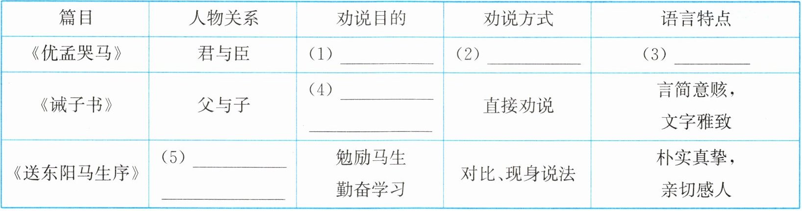 11. 新趋势 关联教材 《优孟哭马》《诫子书》《送东阳马生序》中都有劝说的内容,请结合文章内容填写下表。