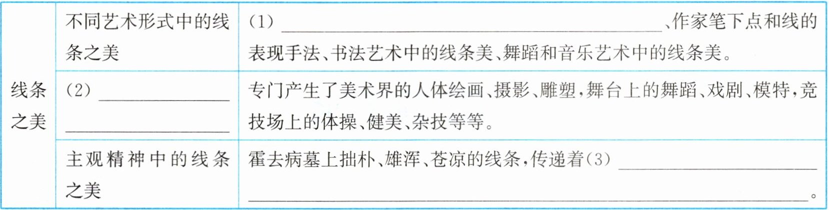 9. 新趋势开放探究 作者认为线条是“一种虚幻的、没有穷尽的,可以寄托我们任何理想、情感和审美的美”,请你寻找一个生活中的事例,印证作者的观点,写出你的审美体验。