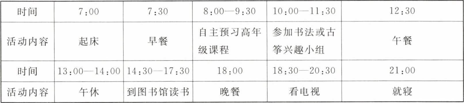 (二) 新素材 热点话题 (2024·江苏宿迁)暑期将至,学校开展“假期生活规划”主题活动,请你参加,完成任务。(11分)