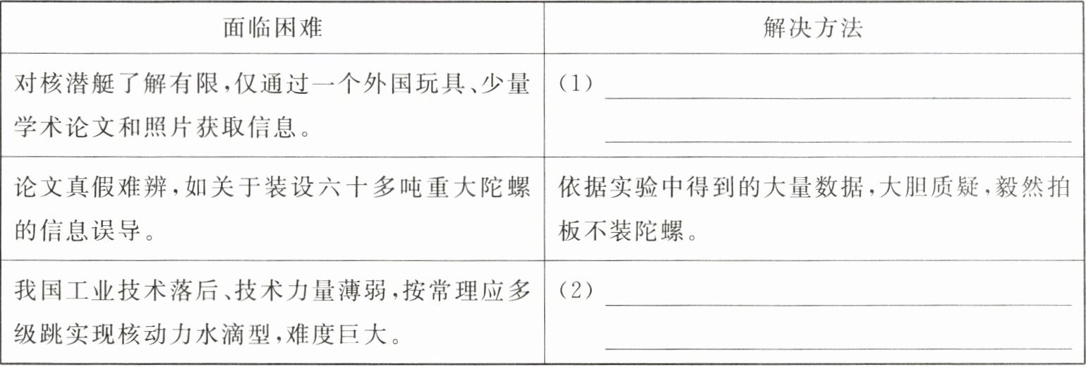 12. 请梳理黄旭华在核潜艇研制过程中面临的困难及解决方法,完成以下表格。(4分)
