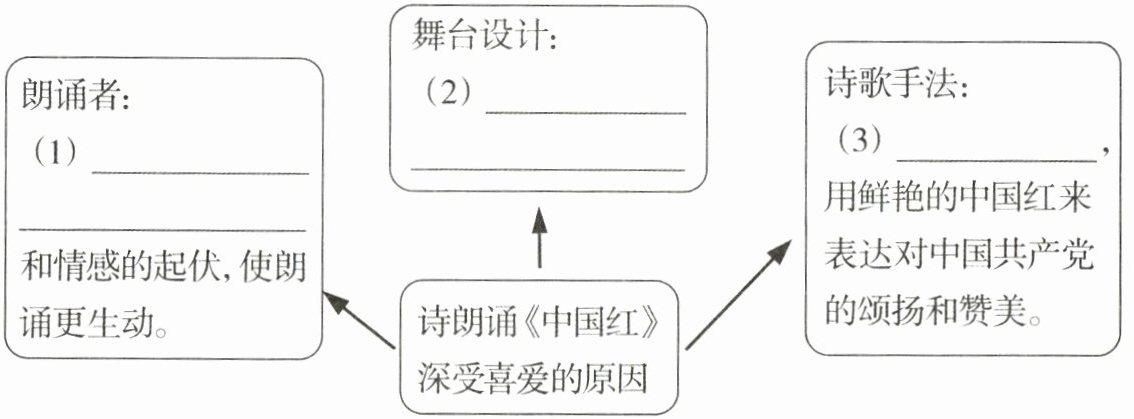 12. 新趋势 思维导图 诗朗诵《中国红》深受喜爱的主要原因有哪些?请联系材料一、材料二,完成下面的思维导图。(3 分)