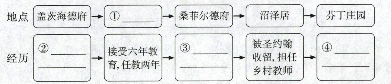 答案:(1)①洛伍德学校 ②寄居舅妈家,受尽虐待 ③担任家庭教师,与罗切斯特相爱 ④与罗切斯特举行婚礼 (2)示例:①不恋财富,不媚世俗 ②面对宋为富,“打草惊蛇”让其不敢靠近,又“反间计”策反宋府丫鬟,帮助脱身,最后“走为上策”为自己脱身 ③在寄宿的舅妈家和表哥发生冲突,瘦小的她敢于和表哥扭打
