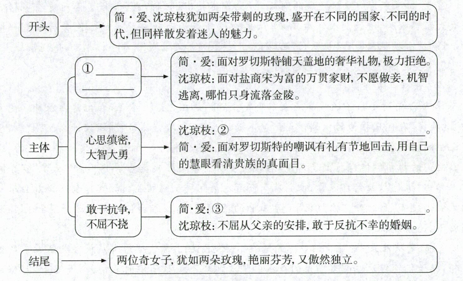 (2) 小智阅读《简·爱》后,发现简·爱与《儒林外史》中的沈琼枝有许多共性,他决定撰写一篇小论文,下面是他列的论文提纲初稿,请你帮他完善。(6分)