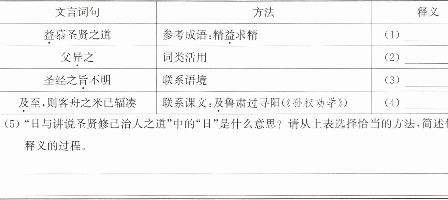 16. (1)更加 (2)对……感到诧异 (3)主旨,要义 (4)等到 (5)示例一:“日”是“每天”的意思。选择词类活用法:句中“日”修饰动词“讲说”,表示动作的频率,据此推断意思是“每天”。 示例二:“日”是“每天”的意思。选择联系课文法:课文中“吾日三省吾身”意思是“我每天多次进行自我检查”,句中“日”的意思是“每天”,据此可知“日与讲说圣贤修己治人之道”中的“日”也是“每天”的意思。
