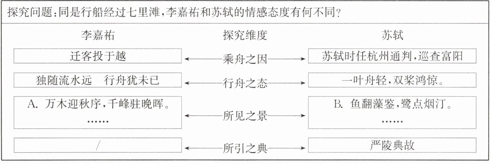 6. 新趋势 对比阅读 同是行船经过七里滩,李嘉祐与苏轼的情感态度有什么不同?结合上面的“乘舟之因”“行舟之态”“所引之典”阐述你的看法。