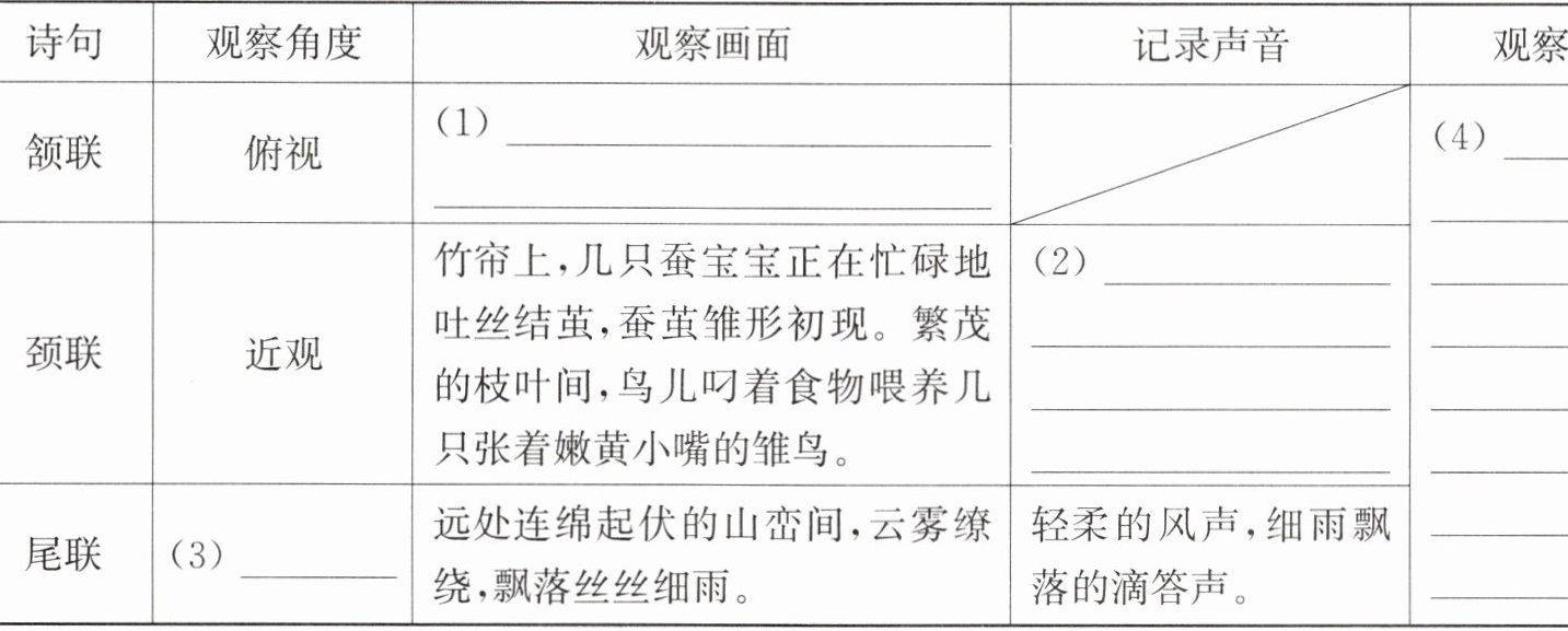 4. 亮点原创 小邗同学想用观察笔记展现元稹笔下的立夏,请帮他完成。