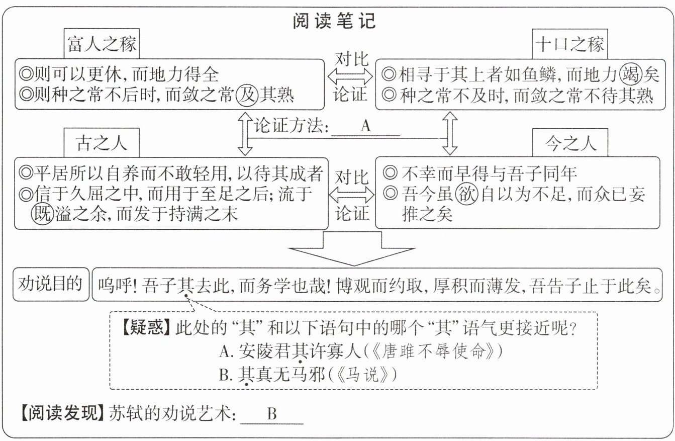 (4)结合阅读笔记与文章内容,赏析苏轼的劝说艺术,补全 B 处的阅读发现。