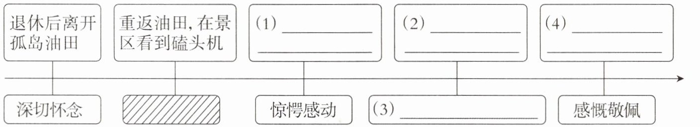 答案:5. (1)在景区偶遇年轻住井工 (2)到年轻住井工家里参观,并了解他们的情况 (3)关心疼惜 (4)告别年轻住井工,来到黄河故道天然柳林景点