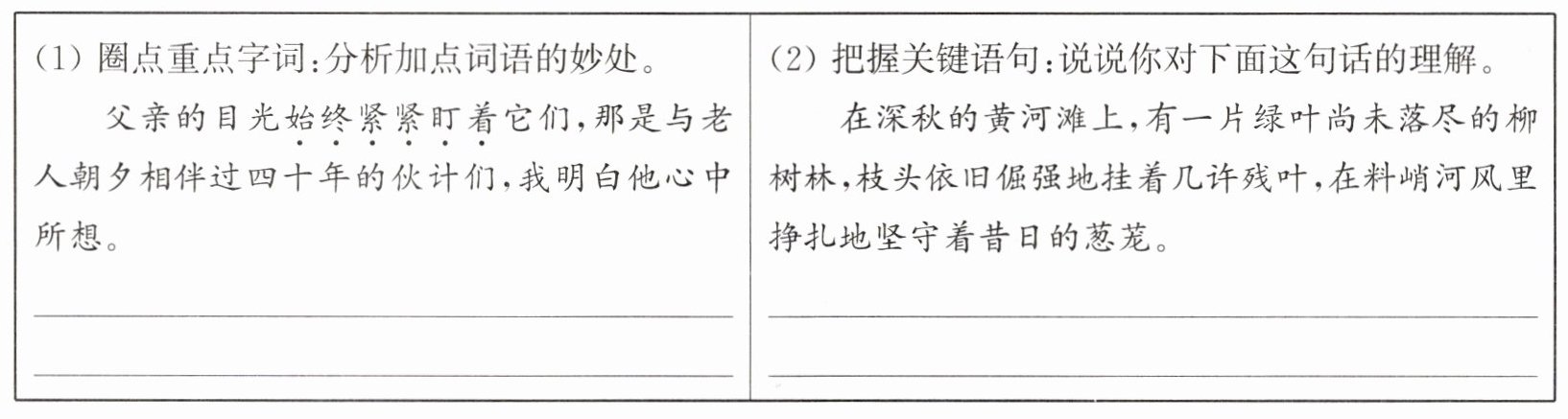 6. (1)“始终”强调了时间的持久,“紧紧盯着”写出了高度专注的神态,这两个细节,既写出了父亲见到曾经一起工作过的“伙计们”时的激动,也体现了父亲对磕头机、对油田的怀念之情,以及对往昔岁月的深切追忆。 (2)这句话运用拟人的修辞手法,以“倔强”“挣扎”“坚守”等词赋予柳树人的特征,以柳树象征在艰苦环境中顽强不屈、坚守奉献的石油工人,表达了作者对石油工人优秀品质的赞美。