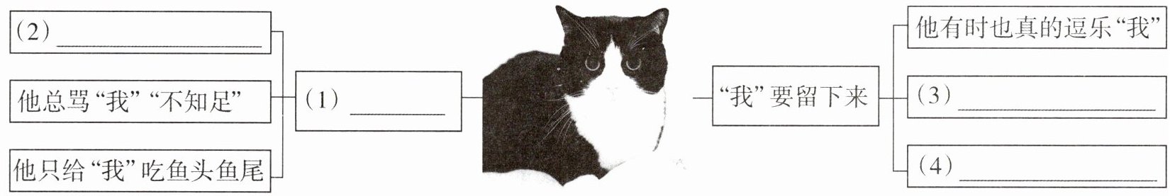 答案:6. (1)“我”想离开 (2)他心情不好就拿“我”撒气(或:他有时作践“我”,使“我”万般痛苦)(3)“我”能有稳定的食物 (4)“我”害怕被四楼那家人逮住