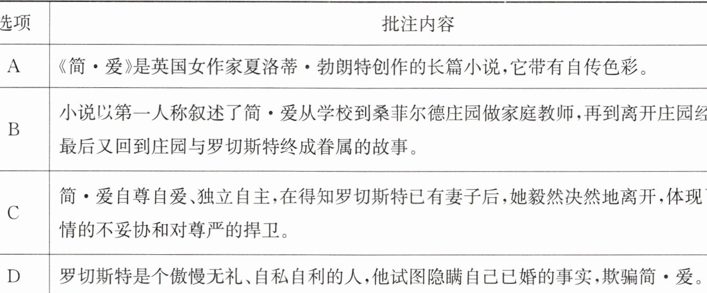4. (2025·山东聊城一模)同学们阅读了《简·爱》,以下是四位同学做的批注,其中有一处错误,请你指出并修改。