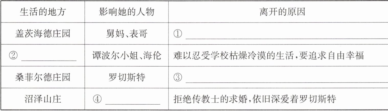 (1)梳理主要人物活动轨迹是阅读小说的重要方法,请根据《简·爱》的故事情节,在表格中完善简·爱的主要经历。