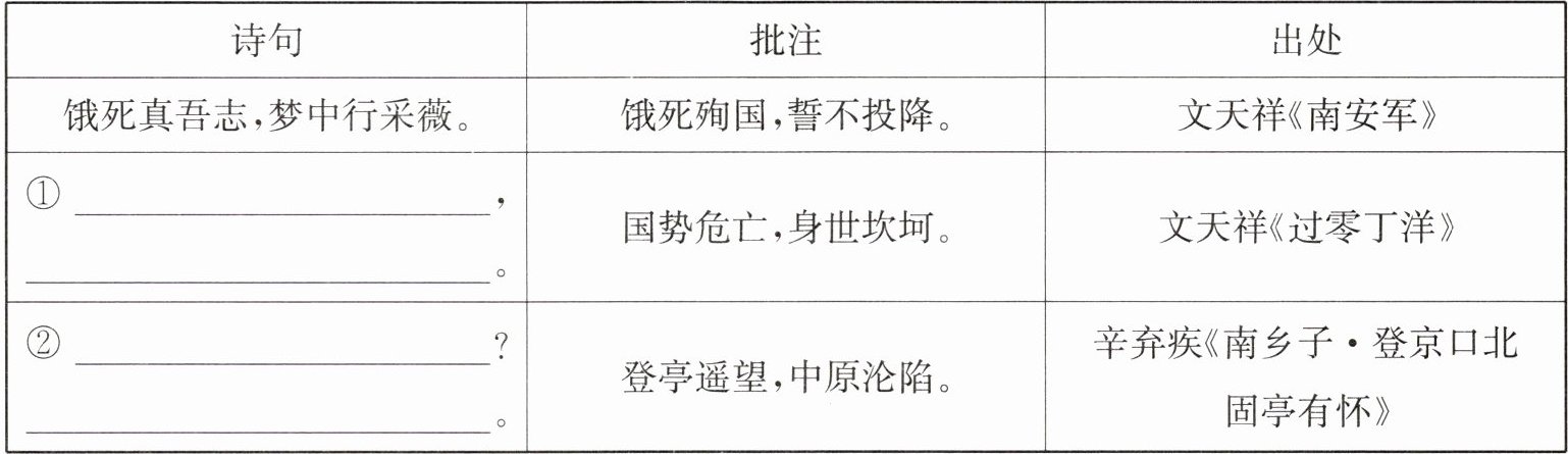 答案:2. (1)①奉命于危难之间 ②古今多少事 ③纷纷暮雪下辕门 ④不知饴阿谁 ⑤一抹晚烟荒戍垒 ⑥一蓑烟雨任平生 (2)①山河破碎风飘絮 身世浮沉雨打萍 ②何处望神州 满眼风光北固楼