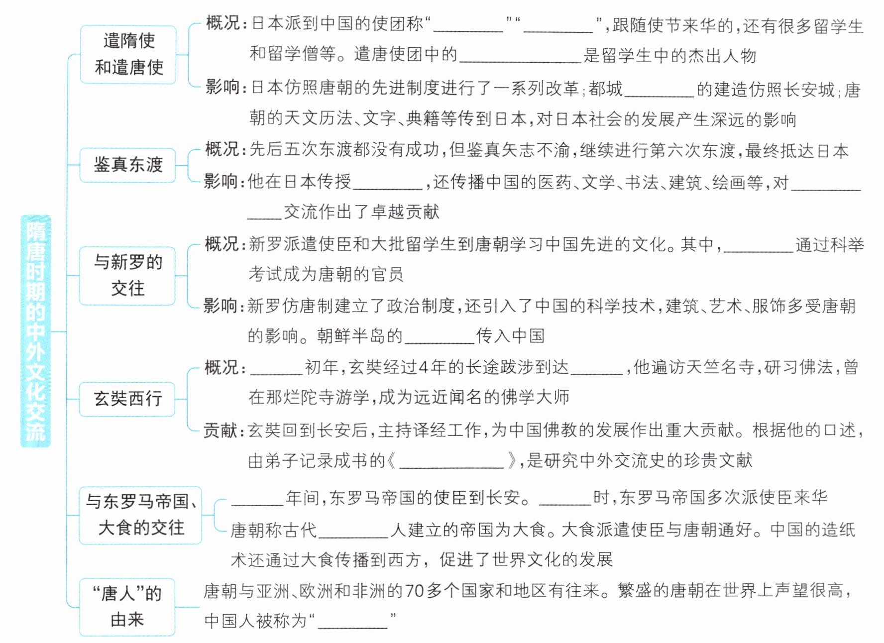 ”答案:遣隋使 遣唐使 阿倍仲麻吕 平城京 佛法 中日文化 崔致远 音乐 贞观 天竺 大唐西域记 贞观 开元 阿拉伯 唐人