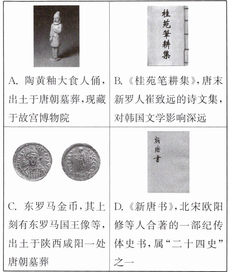 (2)材料二中的四则史料分别属于史料类别中的哪一类?若要深入研究唐朝对外交往的相关历史,你会优先选择哪一类史料?说明理由。