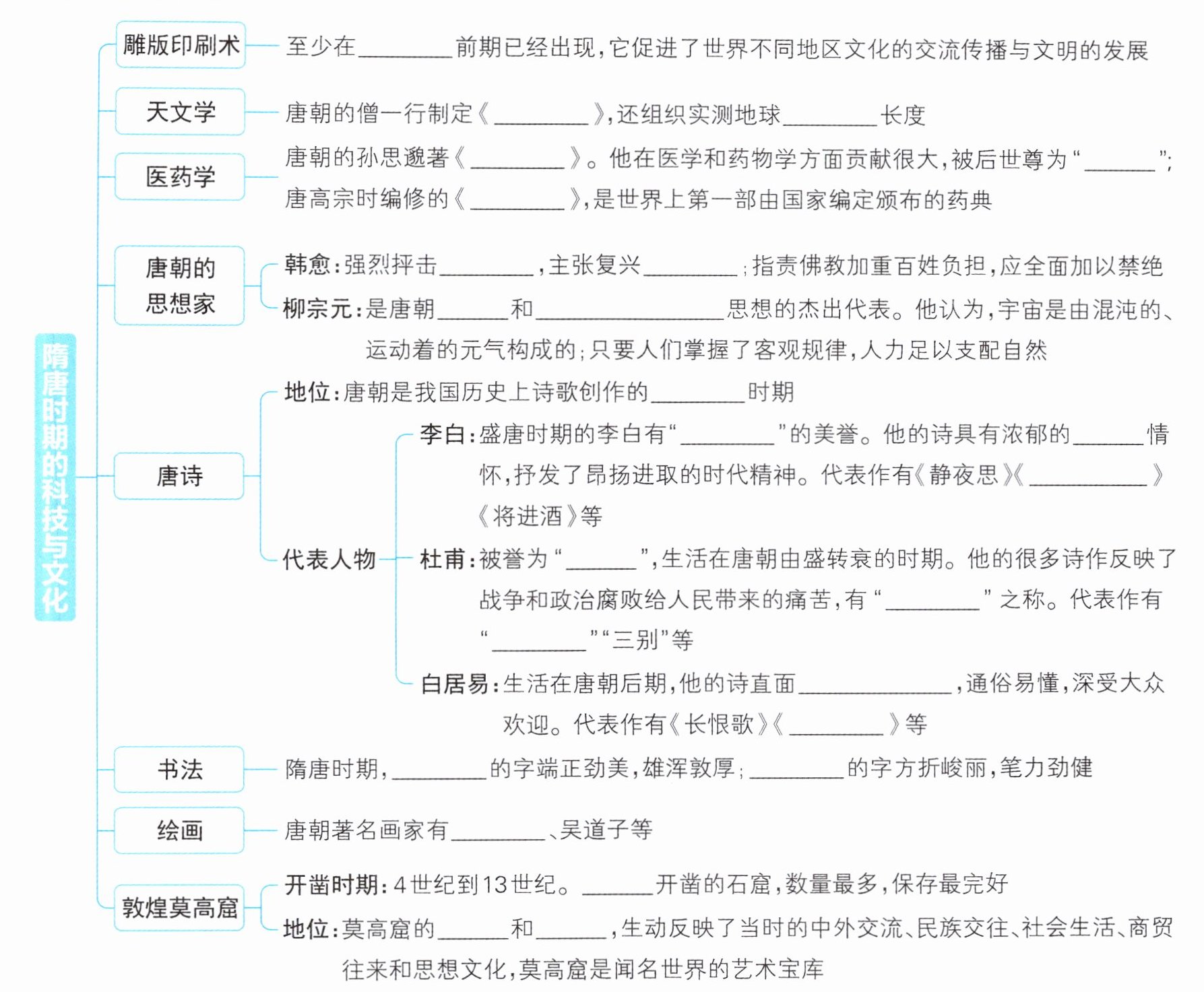 唐朝 大衍历 子午线 千金方 药王 唐本草 佛教 儒学 无神论 朴素唯物主义 黄金 诗仙 浪漫 早发白帝城 诗圣 诗史 三吏 社会现实 琵琶行 颜真卿 柳公权 阎立本 唐朝 壁画 彩塑
