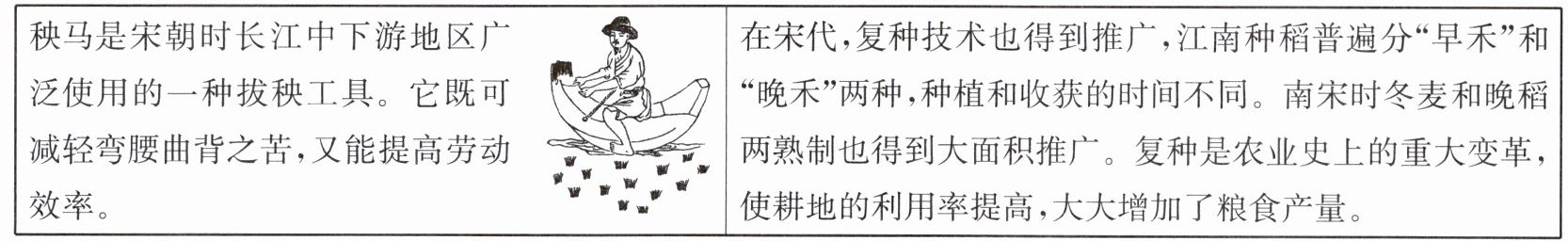 答案:1. B 解析:依据题干材料“秧马是宋朝时长江中下游地区广泛使用的一种拔秧工具。它既可减轻弯腰曲背之苦,又能提高劳动效率”“复种是农业史上的重大变革,使耕地的利用率提高,大大增加了粮食产量”可知,科学技术的进步推动了农业生产的发展。因此,本题正确答案为 B。