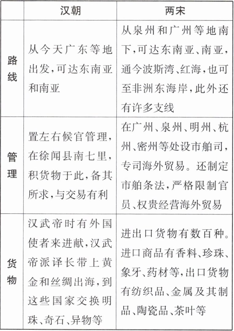 材料三 汉、两宋时期南方海上丝绸之路比较表。