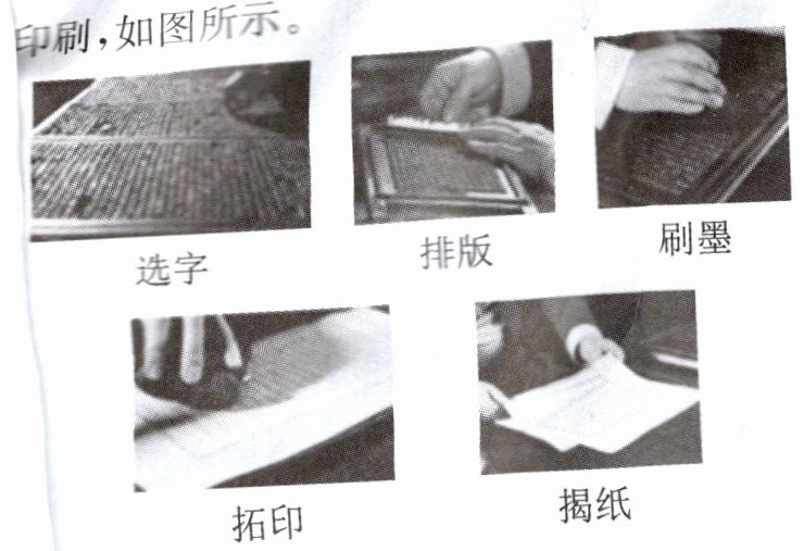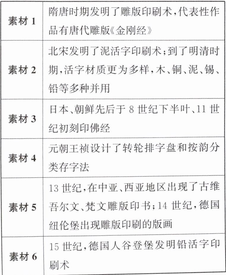 答案:7. (1)优点:排版自由灵活;易于修改;一字多用等。 人物:毕昇。 (2)示例一:选择素材:素材1、素材2、素材4。标题:中国印刷术的发明与发展。 示例二:选择素材:素材3、素材5。标题:中国印刷术的传播。 (3)途径:到图书馆查阅相关资料、通过网络搜索相关资料、咨询专业技术人员等。(答对两点即可)