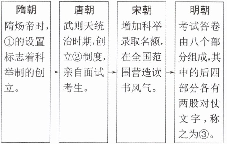 | 隋朝 隋炀帝时,①的设置标志着科举制的创立。 | 唐朝 武则天统治时期,创立②制度,亲自面试考生。 | 宋朝 增加科举录取名额,在全国范围营造读书风气。 | 明朝 考试答卷由八个部分组成,其中的后四部分各有两股对仗文字,称之为③。 |