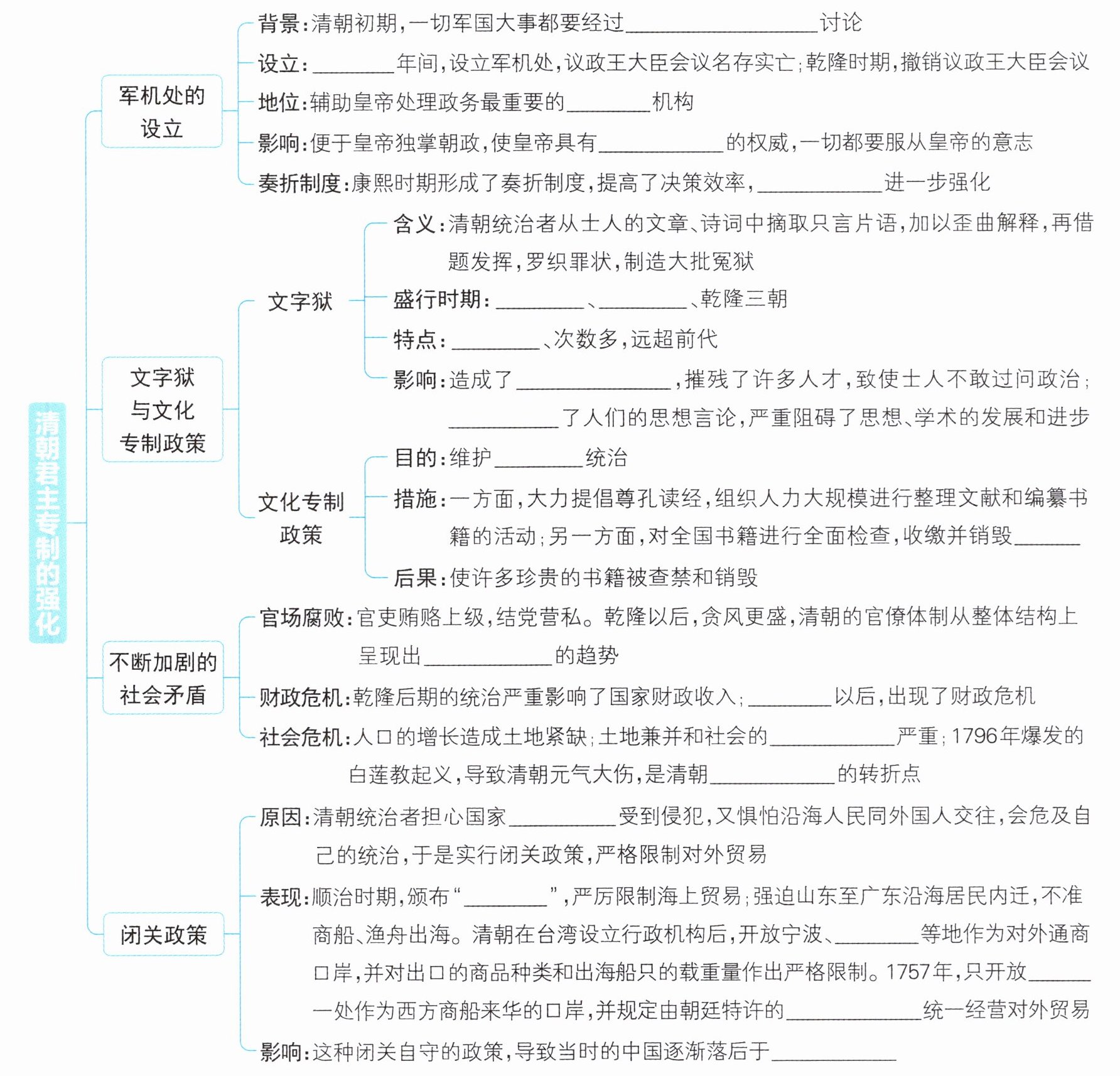 答案:议政王大臣会议 雍正 中枢 至高无上 君主专制 康熙 雍正 规模大 社会恐慌 禁锢 集权 禁书 日益腐败 嘉庆 贫富分化 走向衰落 领土主权 禁海令 漳州 广州 广州十三行 世界潮流