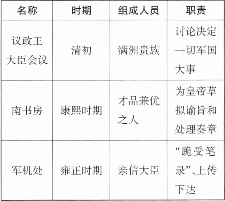 材料一 清朝初年,沿袭满洲贵族议事的旧制,设议政王大臣会议,讨论决定军国大事。康熙初年,四大臣辅政,满洲、蒙古都统俱为议政大臣,六部满人尚书也参与会议。议政王大臣会议较之前有所扩大。康熙帝亲政后加强皇权,会议权限逐渐削弱。民政事务由内阁大学士或六部会议具奏。议政王大臣只议国家典章制度及军事要务。……雍正帝削弱八旗王公权势,议政王大臣会议又被进一步削弱。