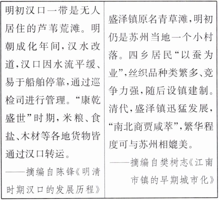 (2)根据材料二,对比明清时期汉口镇和盛泽镇兴起的异同。