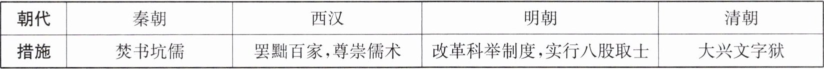2. 秦朝:焚书坑儒;西汉:罢黜百家,尊崇儒术;明朝:改革科举制度,实行八股取士;清朝:大兴文字狱。
