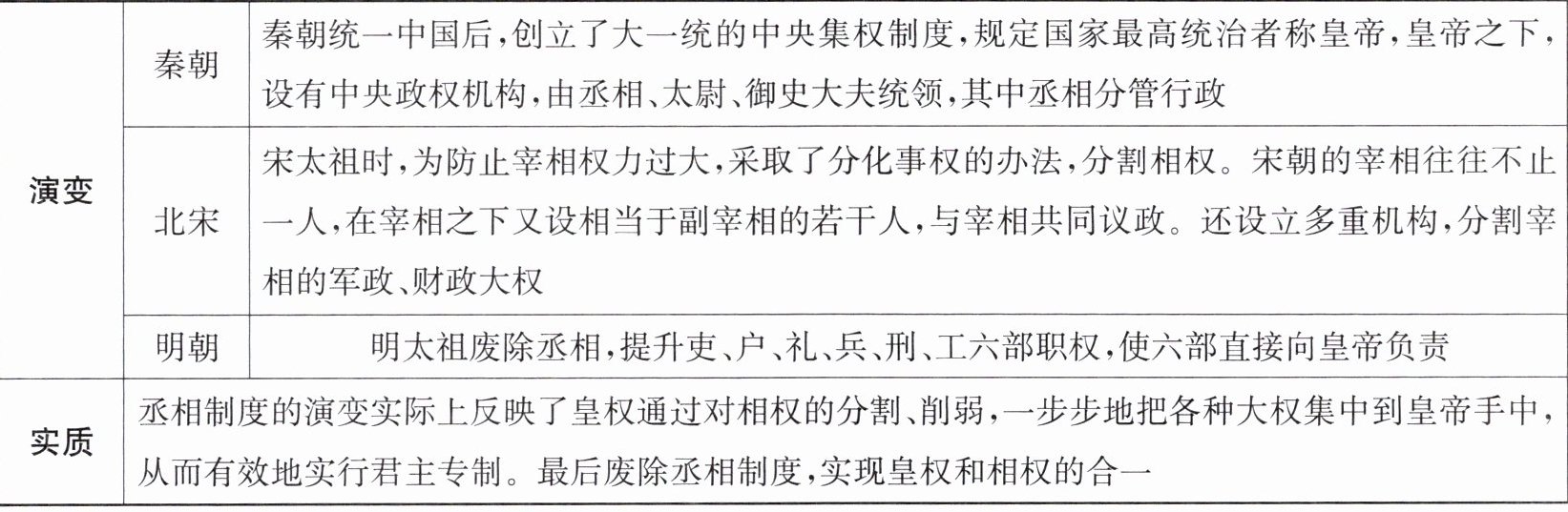 实质:丞相制度的演变实际上反映了皇权通过对相权的分割、削弱,一步步地把各种大权集中到皇帝手中,从而有效地实行君主专制。最后废除丞相制度,实现皇权和相权的合一。
