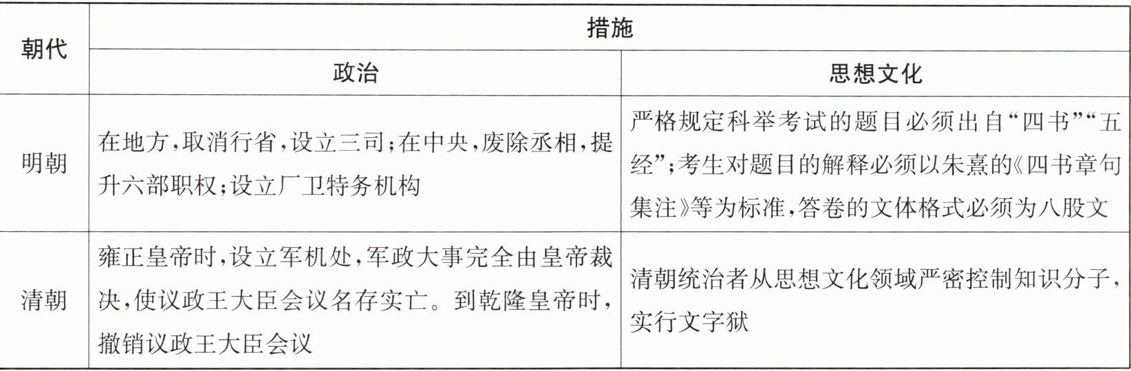 |明朝|在地方,取消行省,设立三司;在中央,废除丞相,提升六部职权;设立厂卫特务机构|严格规定科举考试的题目必须出自“四书”“五经”;考生对题目的解释必须以朱熹的《四书章句集注》为标准,答卷的文体格式必须为八股文|