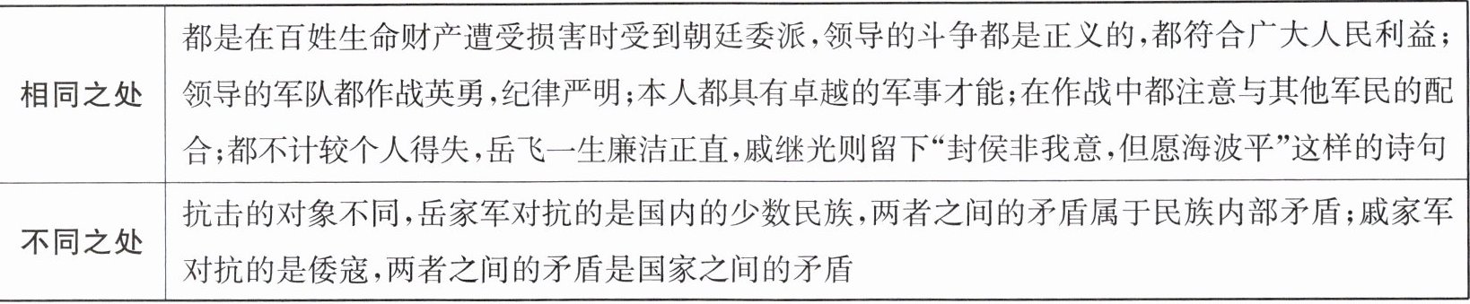 |内容|都是在百姓生命财产遭受损害时受到朝廷委派,领导的斗争都是正义的,都符合广大人民利益;领导的军队都作战英勇,纪律严明;本人都具有卓越的军事才能;在作战中都注意与其他军民的配合;都不计较个人得失,岳飞一生廉洁正直,戚继光则留下“封侯非我意,但愿海波平”这样的诗句|抗击的对象不同,岳家军对抗的是国内的少数民族,两者之间的矛盾属于民族内部矛盾;戚家军对抗的是倭寇,两者之间的矛盾是国家之间的矛盾|