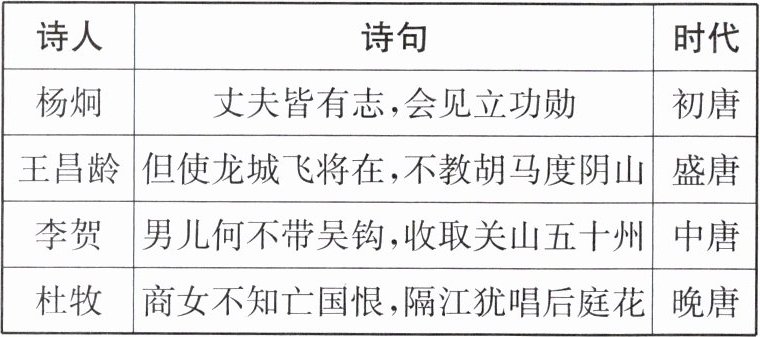答案:1. C 解析:据题干并结合所学可知,杨炯诗句以“立功勋”展现青年进取精神,王昌龄诗句借“飞将”意象表达对边疆安定的渴望,李贺诗句以“收取关山”呼吁收复失地,杜牧诗句通过“亡国恨”批判统治者麻木。四首诗均以个人情感为载体,抒发对国家兴衰的关注,体现了唐代文人“以天下为己任”的家国情怀,故C项符合题意;题干未涉及战争细节描写,仅体现对战争如渴望胜利、批判麻木的态度,排除A项;杨炯、杜牧的诗句没涉及边疆,排除B项;题干仅杜牧的诗暗含对统治阶层的批评,不足以概括整体,排除D项。故选C项。