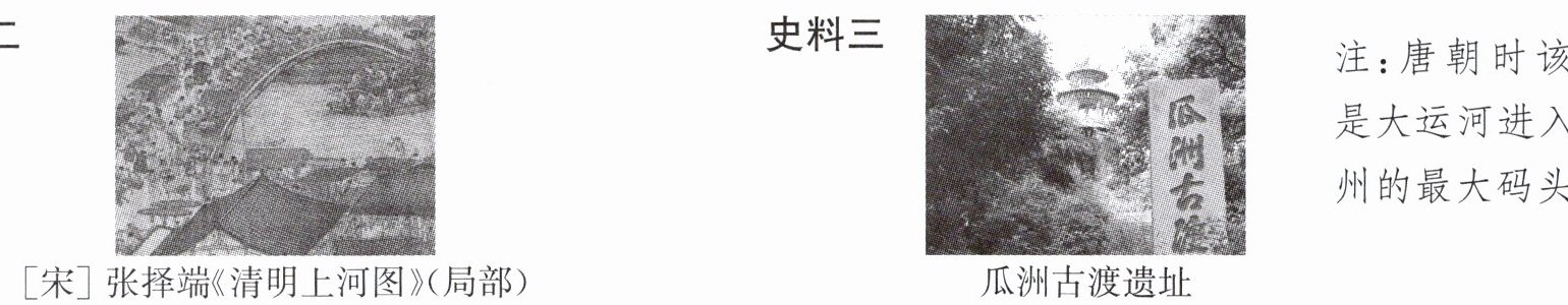 答案:(1) C A 元朝建立了四通八达的驿站,打通了北方和西北被阻断的陆路交通线,建立了与中亚、西亚及东欧等地区的联系,开创了中外交通的新局面。 (2) 选择史料三,瓜洲古渡遗址是研究大运河的实物资料。理由:大运河以洛阳为中心,从北向南分为永济渠、通济渠、邗沟和江南河四段,其中邗沟段位于扬州城北,唐朝时瓜洲古渡是大运河进入扬州的最大码头,证明大运河的开通对后世影响深远;选择史料四,史料四是研究大运河的文献资料。理由:由材料“当时朝廷全仰每年东南漕运数百万石粮食以维持唐王朝统治的正常运行”可以看出大运河在南北交通中的重要作用,大运河加强了南北地区的政治、经济、文化交流。 (3) 结论:水陆交通的发展有利于各地之间的政治、经济、文化交流,促进统一多民族国家的巩固与发展。
