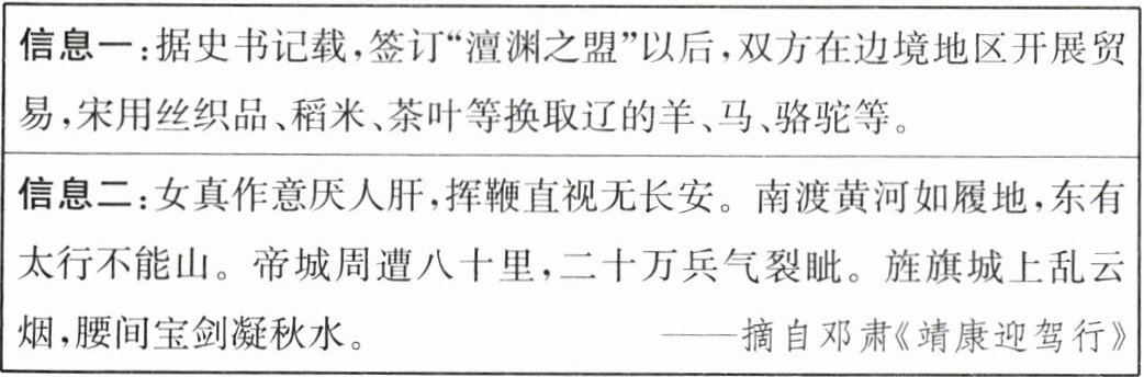 (2)信息一内容反映了宋政权与少数民族政权的议和,它有何积极影响?信息二中的女真人制造了令宋人蒙羞的“靖康之变”,请简要阐述该事件。(8 分)