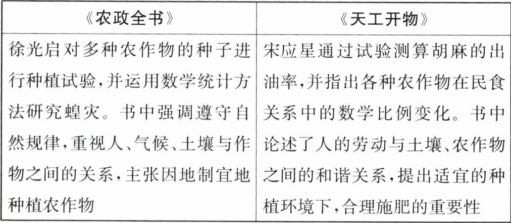 答案:16. (1) 工具:曲辕犁。(2分) 原因:能调节耕地的深浅,省力,提高了耕作效率。(2分) (2) 原因:占城稻品种优良(或占城稻有着耐旱、对环境的适应能力强和生长期短的特点);统治者的重视;北宋气候急剧转旱。(4分,答对其中两点即可) 作用:水稻产量大大提高,宋朝时水稻产量跃居粮食作物首位。(2分) (3) 共同点:都记载了农业生产技术;都总结了前人的成果;都有大量的插图。(2分,答对其中一点即可) 地位:《农政全书》:全面总结了我国古代农业生产的先进经验、技术革新和作者关于农学的创新研究成果,是一部重要的农业科学巨著(或《天工开物》:对我国古代的农业和手工业生产技术进行了全面的总结,记述了中国在当时世界上具有先进水平的科学技术,被誉为“中国17世纪的工艺百科全书”)。(3分) (4) 认识:农业发展关乎国计民生;政府要注重发展农业生产;要注意改进农业生产技术、兴修水利、总结农业生产经验等。(2分,任答一点即可)