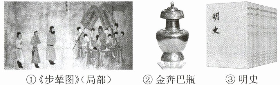 答案:18. (1) A:文成公主 B:驻藏办事大臣(每空2分) 不同:唐朝时期是唐与吐蕃两个政权之间的关系;元、清两朝时期,西藏已正式归中央政府管辖。(4分) (2) 积极意义:有利于统一多民族国家的巩固和发展。(2分) 认识:继承中有创新;因地制宜;坚持大一统原则(或维护国家统一);以和为贵,尊重民族传统,促进民族交融。(答出其中一点即可,3分) (3) 图像史料:①;实物史料:②;文献史料:③。(3分) 方法途径:去图书馆查阅搜集资料;利用互联网等现代技术搜集资料;调查采访搜集史料;参观历史博物馆、寻访历史古迹等。(答出其中两点即可,4分)