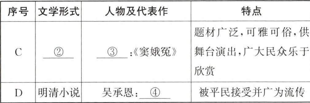 答案:18. (1) ①:宋词;②:元曲;③:关汉卿;④:《西游记》。(4 分) 发展趋势:形式日益丰富多样;受众范围不断扩大;题材更加广泛,贴近生活。(答出其中两点,4 分) (2) 示例:使用说明:用胶泥制成活字,然后排版进行印刷,活字可以重复使用,灵活便捷,提高了印刷效率,对人类文明的发展产生了重大影响。(4 分) (3) 特点:实用性强,大多与农业、手工业等生产生活密切相关;经验性突出,多是对生产经验的总结;发展空间狭小,动力不足。(答出其中两点,4 分) 影响:一方面,推动了中国古代农业、手工业等的发展,促进了社会经济的进步;另一方面,在一定程度上导致了中国近代科技发展的滞后。(4 分)