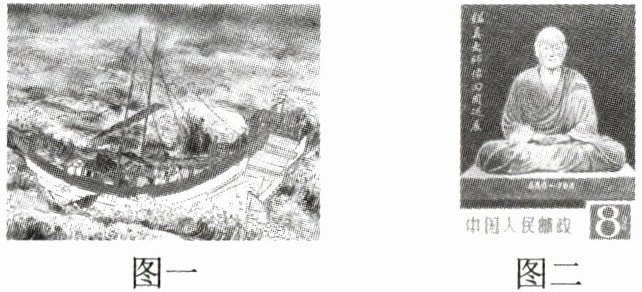 7. (2025·苏州期末)下面图一《弘法大师行状绘词》(局部)描绘了日本弘法大师(即空海和尚)804年随遣唐使入唐求佛法遭遇惊涛骇浪的情形。1980年日本一级国宝鉴真大师木雕坐像由日本回中国巡展,图二是中国人民邮政据此事件发行的纪念邮票。由此可见(