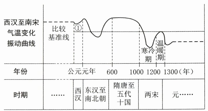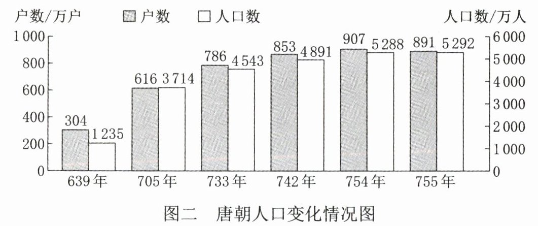 (1)据材料一并结合所学知识,分别指出图一曲线图中唐朝气温的特点和图二人口变化的趋势,说明两者之间的联系。(6分)