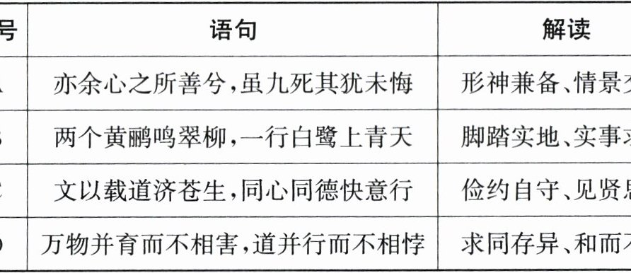)答案:8. D 解析:本题考查弘扬中华人文精神。A 表达对理想的执着追求,与“形神兼备、情景交融”无关,A 错误;B 描绘自然景象,与“脚踏实地、实事求是”无关,B 错误;C 强调以文化服务社会、团结协作,而“俭约自守、见贤思齐”指要节俭和向榜样学习,二者主题不符,C 错误;D 体现包容共存的思想,与“求同存异、和而不同”内涵一致,D 正确。故选 D。