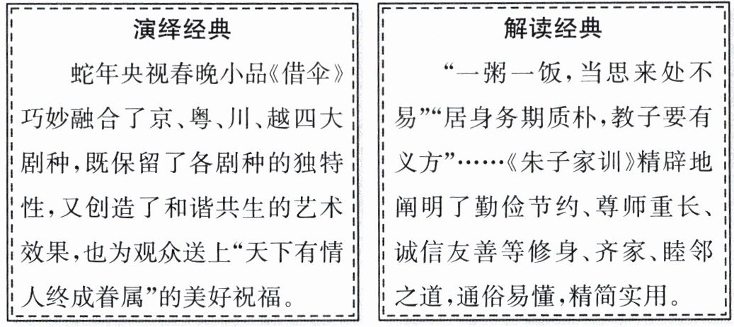 答案:17. (1)①惠民利民、安民富民的思想理念;(3分)②革故鼎新、与时俱进的思想理念。(3分)(2)①“求同存异、和而不同”“俭约自守、中和泰和”的人文精神。(2分)②求同存异、和而不同的处事方法有助于解决人际矛盾,为化解当代社会冲突提供重要启示。(3分)“俭约自守、中和泰和”的生活理念有助于人们坚守做人的品格,克服拜金主义、消费主义、享乐主义。有利于真正实现人的价值。(3分)(3)开展“经典诵读”主题活动:组织同学分组诵读国学经典或家训,分享心得体会,让同学在诵读中感悟传统美德的力量。(4分)