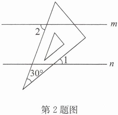 2. (2024·苏州) 如图, 直线 $m // n$, 一块含有 $30^{\circ}$ 角的直角三角尺按如图所示放置. 若 $∠ 1 = 40^{\circ}$, 则 $∠ 2$ 的大小为(