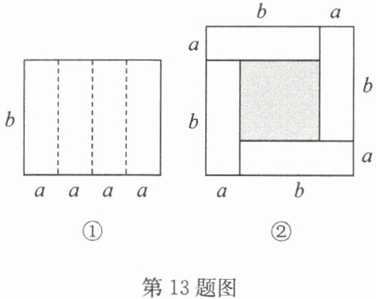13. 我国著名数学家华罗庚曾用诗词表达了“数形结合”的思想,其中谈到“数缺形时少直观,形少数时难入微.数形结合百般好,隔离分家万事休.”请你利用“数形结合”的思想解决以下问题:如图①是一个长为$4a$,宽为$b$的长方形,沿图中虚线用剪刀平均分成四块小长方形,然后用四块小长方形拼成如图②的图形.