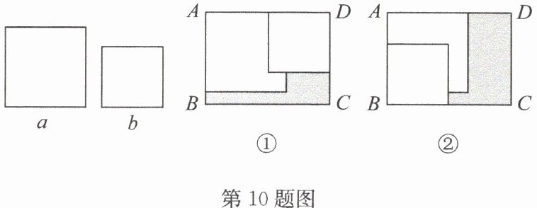 10. 在矩形 $ABCD$ 内,将两张边长分别为 $a$ 和 $b$ $(a> b)$ 的正方形纸片按图①,图②的两种方式放置(图①,图②中两张正方形纸片均有部分重叠),矩形中未被这两张正方形纸片覆盖的部分用阴影表示,设图①中阴影部分的面积为 $S_{1}$,图②中阴影部分的面积为 $S_{2}$.当 $AD - AB = 3$ 时,$S_{2}-S_{1}$ 的值为