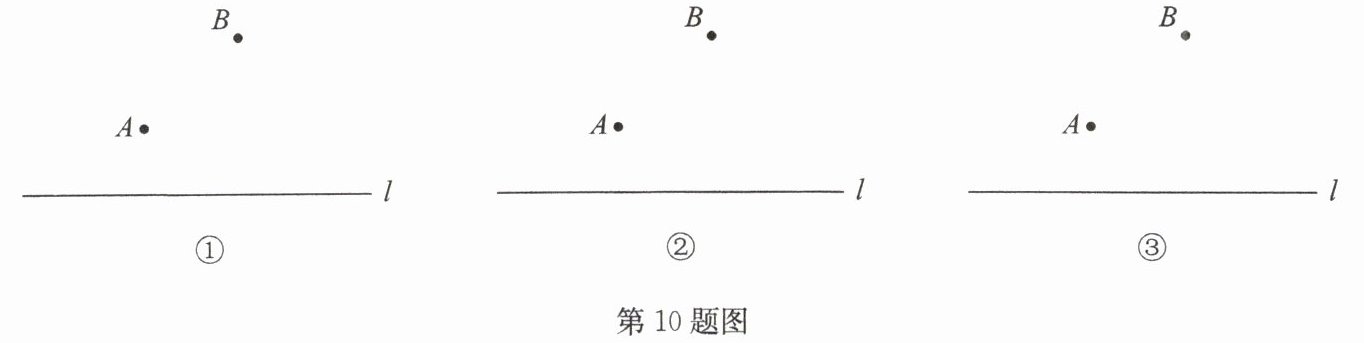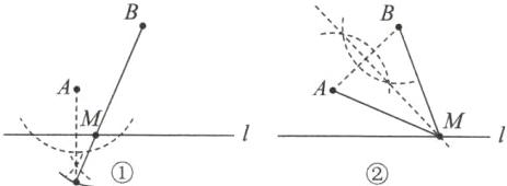 10.(2025·吴江区月考)如图,$ A $,$ B $ 两点在直线$ l $ 的同侧,试分别画出符合条件的点 $ M $。(保留作图痕迹,不写作法)