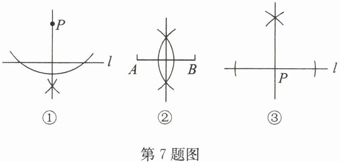 7. 尺规作图要求:Ⅰ. 作线段的垂直平分线;Ⅱ. 过直线上一点作这条直线的垂线;Ⅲ. 过直线外一点作这条直线的垂线。如图是按上述要求排乱顺序的尺规作图: