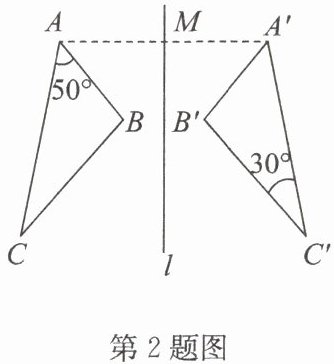 2. (2024·建邺区期中)如图,△ABC与△A′B′C′关于直线l对称,连接AA′交对称轴l于点M.若∠A=50°,∠C′=30°,则下列结论不正确的是(
