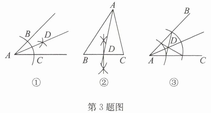 图③:以点A为圆心,任意长为半径画弧,交AB、AC于两点,再以其中一点为圆心,适当长为半径画弧,交AC于点D,连接AD。根据角平分线的尺规作图方法,AD平分∠BAC。