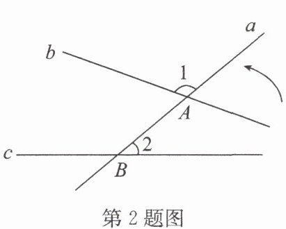 2. (2025·江阴期中)如图,直线$a$与直线$b$交于点$A$,与直线$c$交于点$B$,$∠ 1 = 120^{\circ}$,$∠ 2 = 40^{\circ}$。若使直线$b$与直线$c$平行,则可将直线$b$绕点$A$逆时针旋转(